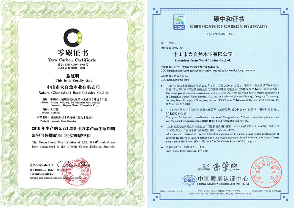 早在2010年,大自然家居就創(chuàng)新推出了零碳地板,并獲得零碳證書,產(chǎn)品進入了上海世博會零碳館。2021年9月,大自然家居通過了中國質(zhì)量認證中心的碳中和認證,獲得了行業(yè)第一張?zhí)贾泻妥C書。