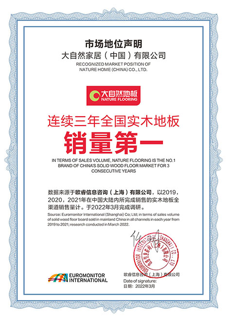 2022年3月,歐睿信息咨詢公司發(fā)布的市場調(diào)研報告顯示,在中國大陸市場全渠道銷量中,大自然實木地板從2019年至2021年,連續(xù)三年銷量第一。