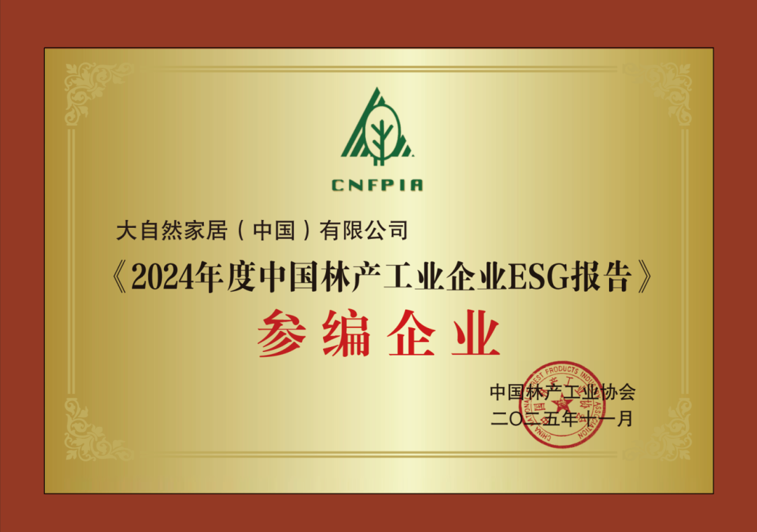 11 月 12 日,2025 全球飾面大會(huì)隆重召開,大自然家居應(yīng)邀參會(huì),與近千家名企共話行業(yè)發(fā)展趨勢、分享創(chuàng)新成果。會(huì)上,由中國林產(chǎn)工業(yè)協(xié)會(huì)主導(dǎo)的《2024 年度中國林產(chǎn)工業(yè)企業(yè)ESG報(bào)告》正式發(fā)布,大自然家居憑借突出貢獻(xiàn)獲頒參編證書,并在會(huì)上同步推出《大自然家居 2024 年社會(huì)責(zé)任報(bào)告》,全面展現(xiàn)企業(yè)在綠色發(fā)展、社會(huì)責(zé)任等領(lǐng)域的實(shí)踐與成效。