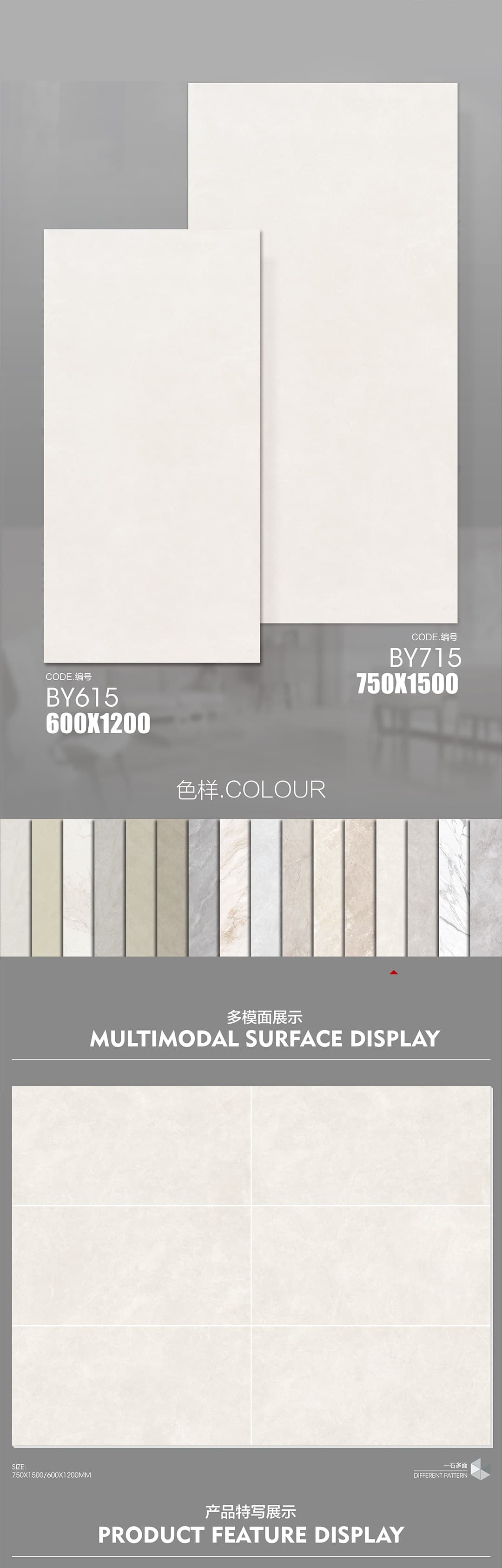 | 產(chǎn)品特性 | 表面柔和,防污效果強(qiáng),防滑R10指標(biāo)高,抗折強(qiáng)度好 |